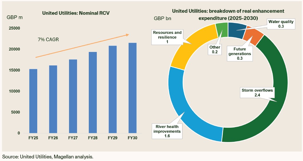 • These listed water utilities are instrumental in delivering the government’s planned investment overhaul. In the current regulatory period (2025-2030), Severn Trent guides to 60% growth in its Regulated Capital Value (RCV or RAB) while United Utilities expects >40% growth in its RCV over the same period.