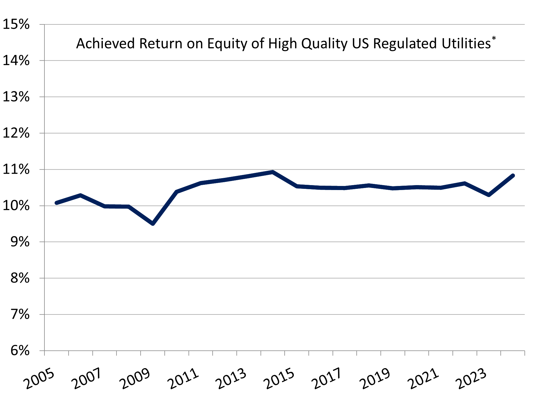 As a result, high-quality, regulated utilities can achieve solid financial results, even in challenging conditions. This is demonstrated in Figure 2 below, which shows return on equity (ROE) for a sample set of high-quality, US regulated utilities. The chart shows that even in the 2007-2009 recession, a major and broad-based global downturn, the achieved ROE for these high-quality regulated utilities fell from around 10.3% to around 9.5%; and this at a time when most companies were struggling to maintain profitability.