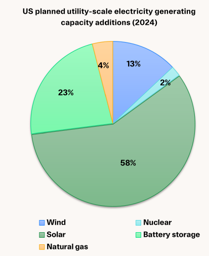 This strength is clear when looking at planned new additions to US electricity-generating capacity in 2024: 81% of this new, 62.8 GW of capacity was solar and battery storage, as shown in the following chart.